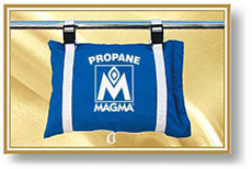 Safe, convenient and essential for boats without approved propane or butane gas storage lockers. Stows 3 disposable butane or propane canisters safely out-over-the-water. Made of water and fade resistant heavy duty nautical blue polyester boat cover material. Has heavy nylon adjustable straps with snap connectors for attaching to a horizontal rail or lifeline.