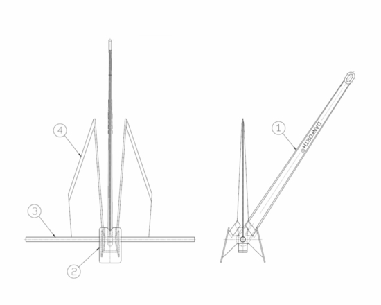 Each Danforth anchor is manufactured with four main components – the 1) shank 2) crown 3) stock and 4) flukes. As you review the dimensions below, please refer to this diagram for assistance. Boat size recommendations are provided based on normal wind conditions, average currents, and a minimum 5:1 scope ratio.